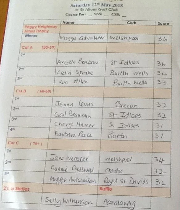 Seniors Trophy Results - St Idloes, 12th May 2018