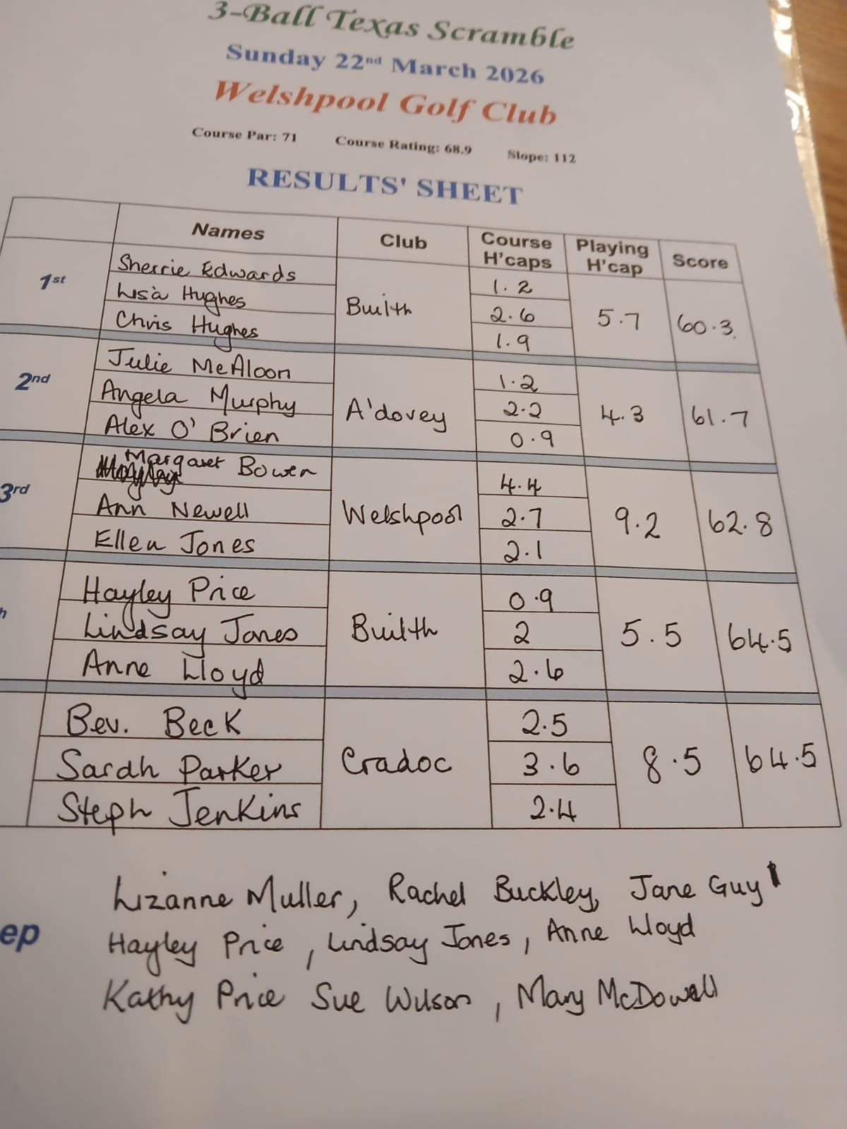 Teams of 3 Scramble. Welshpool. Results