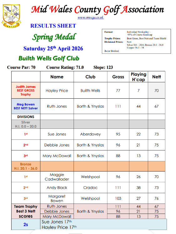 Congratulations to our winners in the Spring Medal which was played at Builth in the glorious sunshine yesterday. The course was in fantastic condition! Thank you to Builth for hosting and to everyone that made it a success β³οΈπ Our next competition is the MWCGA Seniors Trophy on the 9th May, at Borth & Ynyslas followed by the MWCGA Stableford at Brecon GC on Sat 13th June. Entry Forms